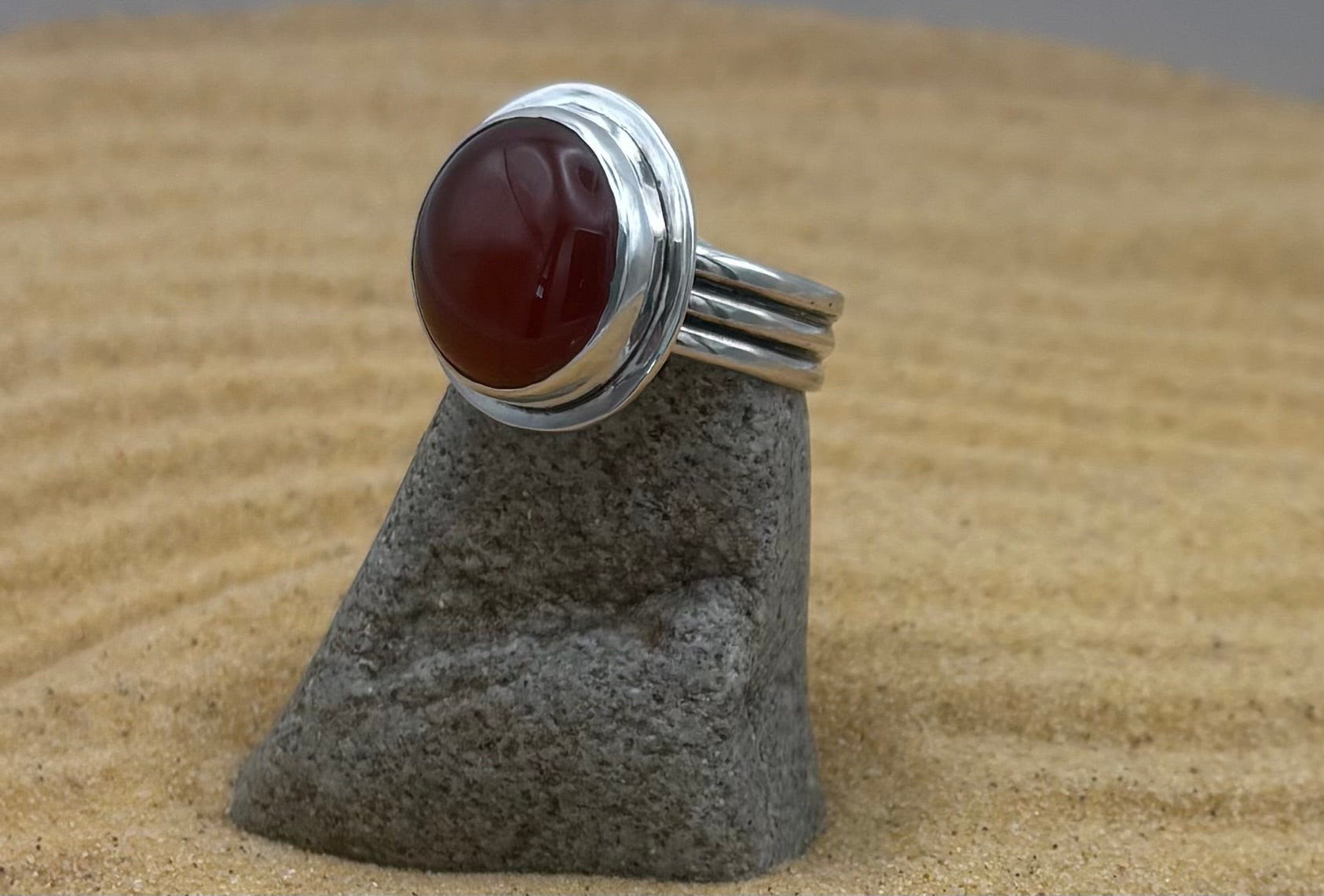 Crafted from sterling silver, the Fiery Grace Carnelian Ring features a bold, large band that commands attention. The vibrant carnelian stone adds a striking warmth and depth, making this piece a sophisticated statement of strength and elegance. Perfect for those who appreciate expert craftsmanship and timeless design.